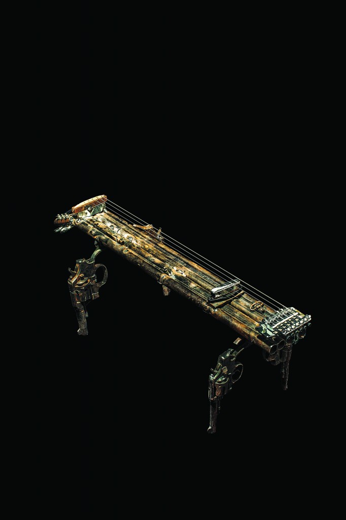 Imagine is a set of 50 musical instruments fabricated out of destroyed weapons – revolvers, shot-guns, machine-guns, etc. This work is a progression of Palas por Pistolas (2008), where 1527 weapons were melted and made into the same number of shovels to plant 1527 trees. In April this year I got a call from the government who had learned about Palas por Pistolas, they told me a public destruction of weapons was to take place in Ciudad Juarez and asked me if I was interested in keeping the metal, which would otherwise have been buried as usual. I accepted the material but I wanted to do something new this time. 6700 weapons, cut into parts and rendered useless, were given to me and I set out to make them into instruments.